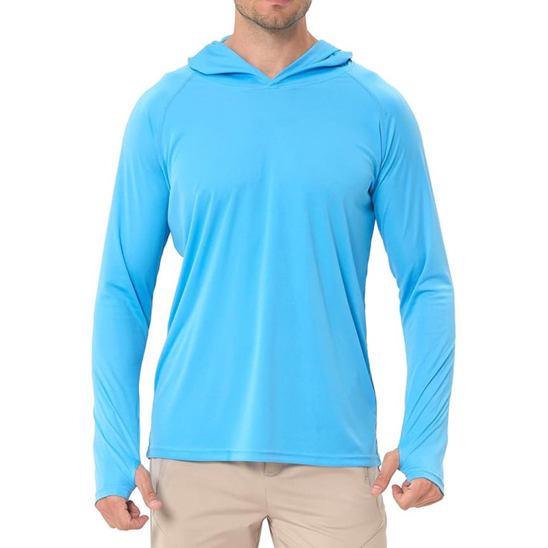 The 50+ UPF sun protection provides excellent protection from harmful rays while also feeling light and breezy. The hood stays on easily without being bulky or restrictive, keeping your neck, ears, and scalp from burning, and the thumbholes allow the sleeves to stay in place while you hike, surf, fish, and garden, while also protecting your hands. The 100% polyester material dries quickly, making it useful during trips. You can rinse it off during camping trips to dry overnight while you sleep, and it helps keep you cool and dry during activities that make you sweat.