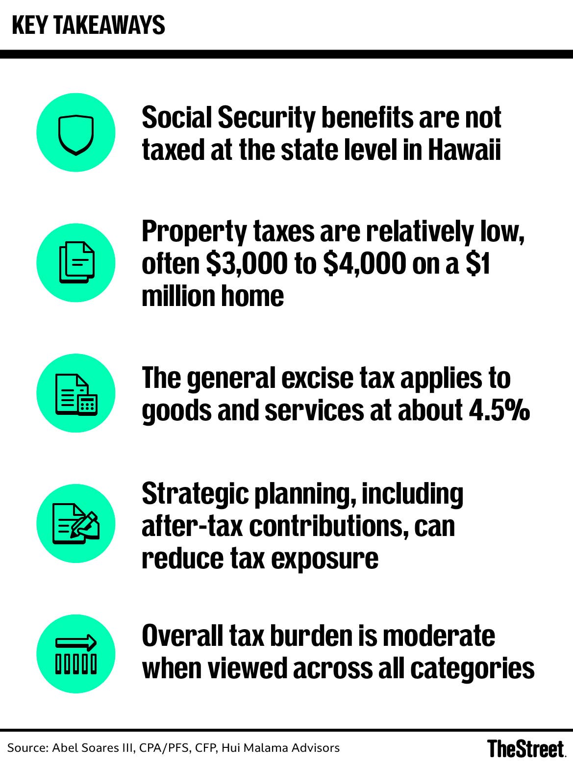Soares: Hawaii has a progressive income tax system, ranging from about 1.4% to nearly 11%. That puts it on the higher end nationally. But it’s important to look at total taxes, not just income taxes. That includes sales-type taxes and other factors that can affect your overall burden.